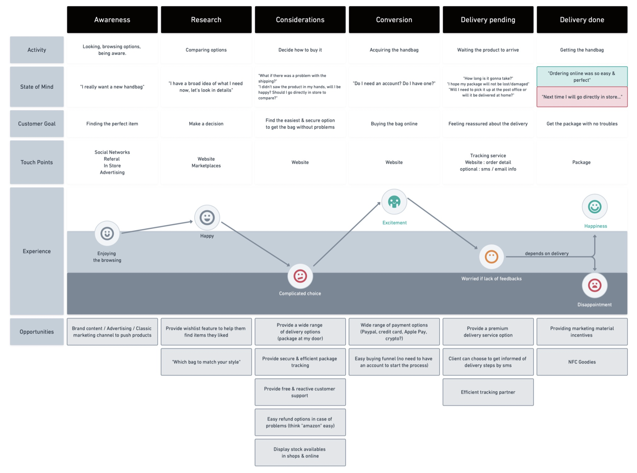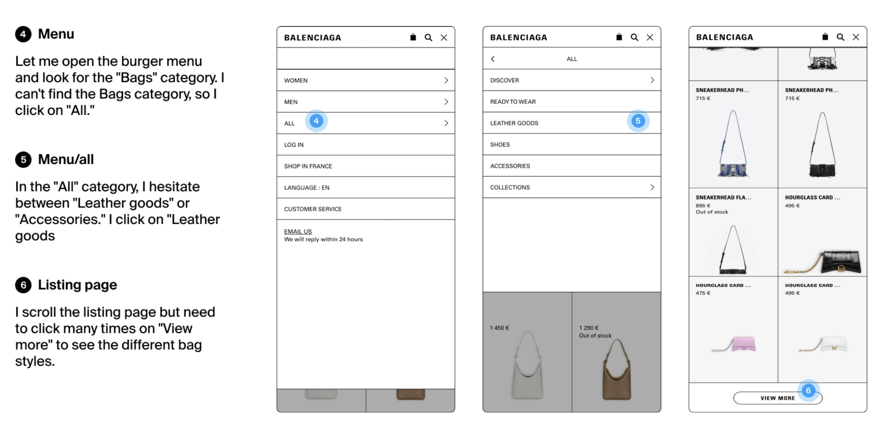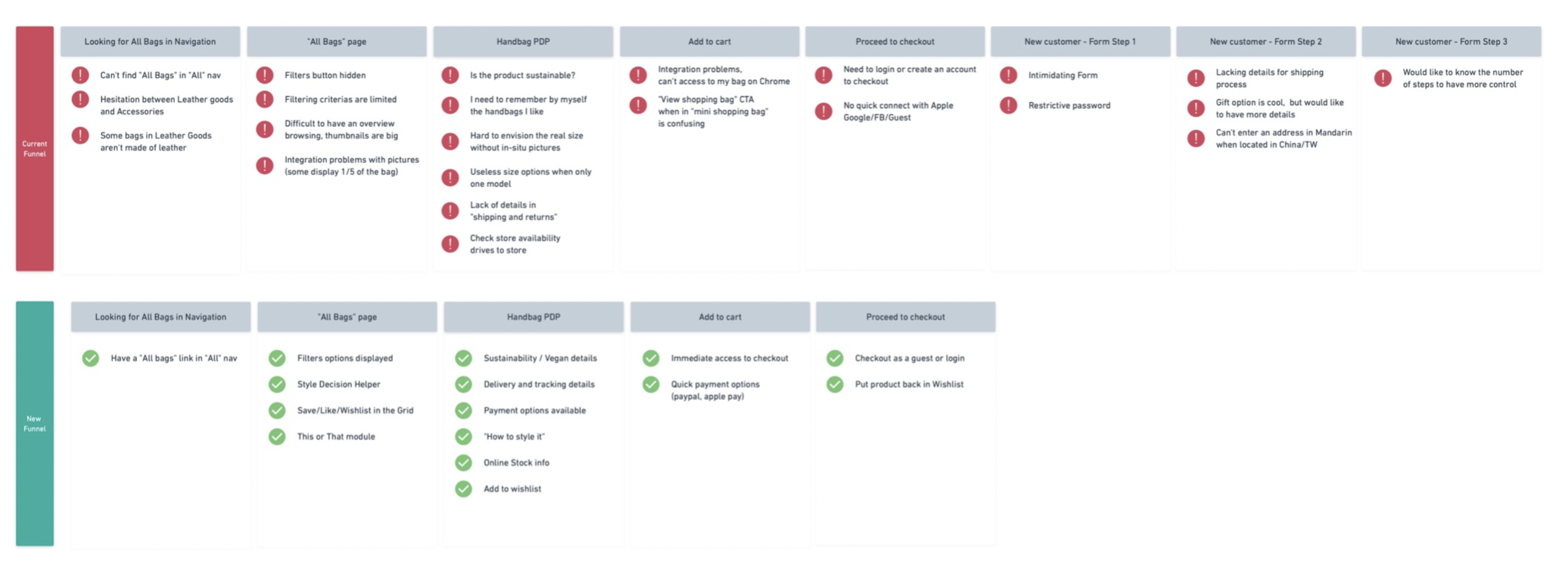 To respond to the pitch, my initial objective was to conduct an audit of the current user journey for bags. I conducted a comprehensive assessment of the mobile flow, pinpointing any problematic areas I encountered, whether they were related to ergonomics or content.